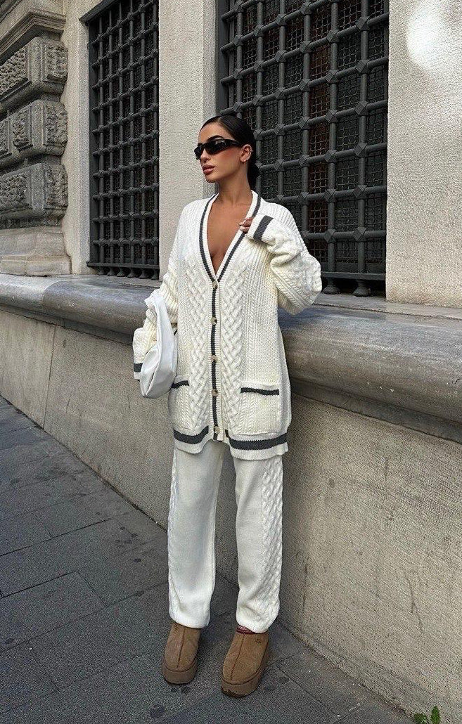 White & grey knit set with a soft, relaxed fit.