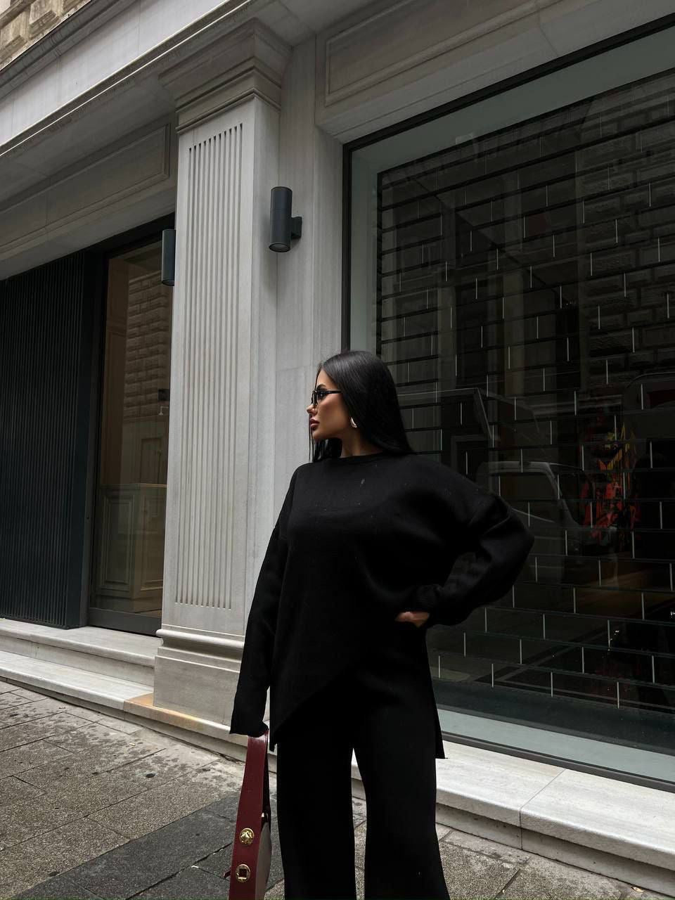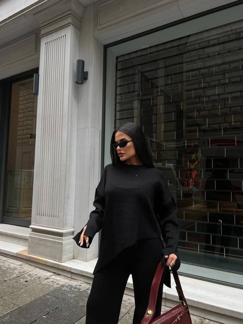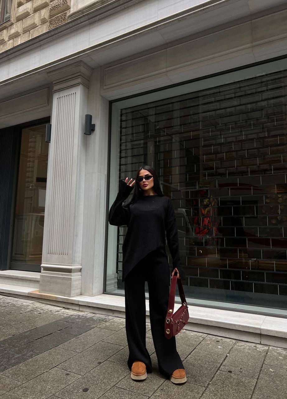 A cozy winter two-piece, featuring a relaxed sweater and comfy pants in classic black.