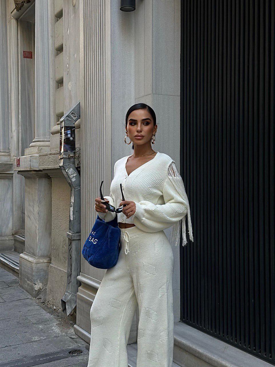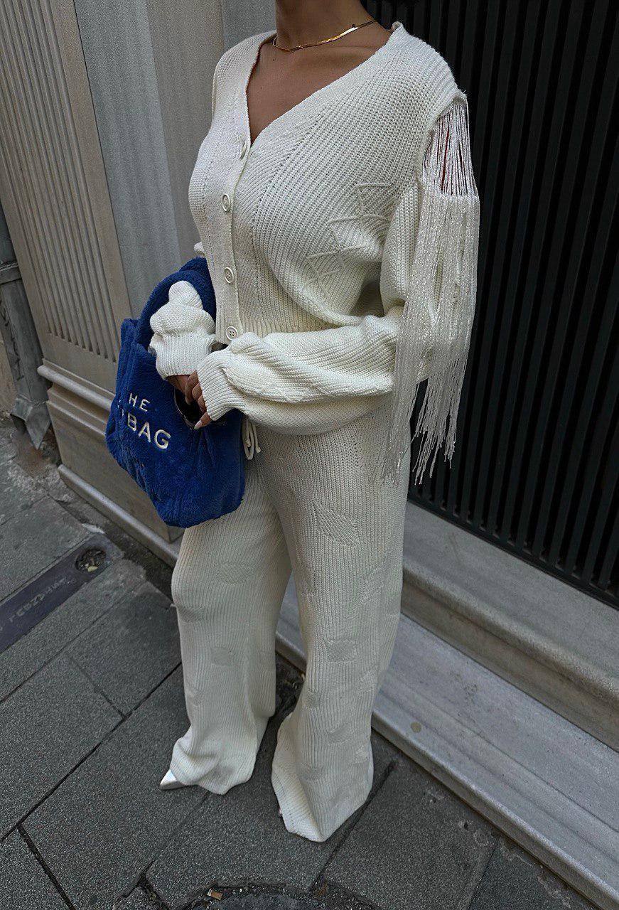 Cozy and cool! This set features a playful sleeve tassels for a laid-back yet standout winter look.