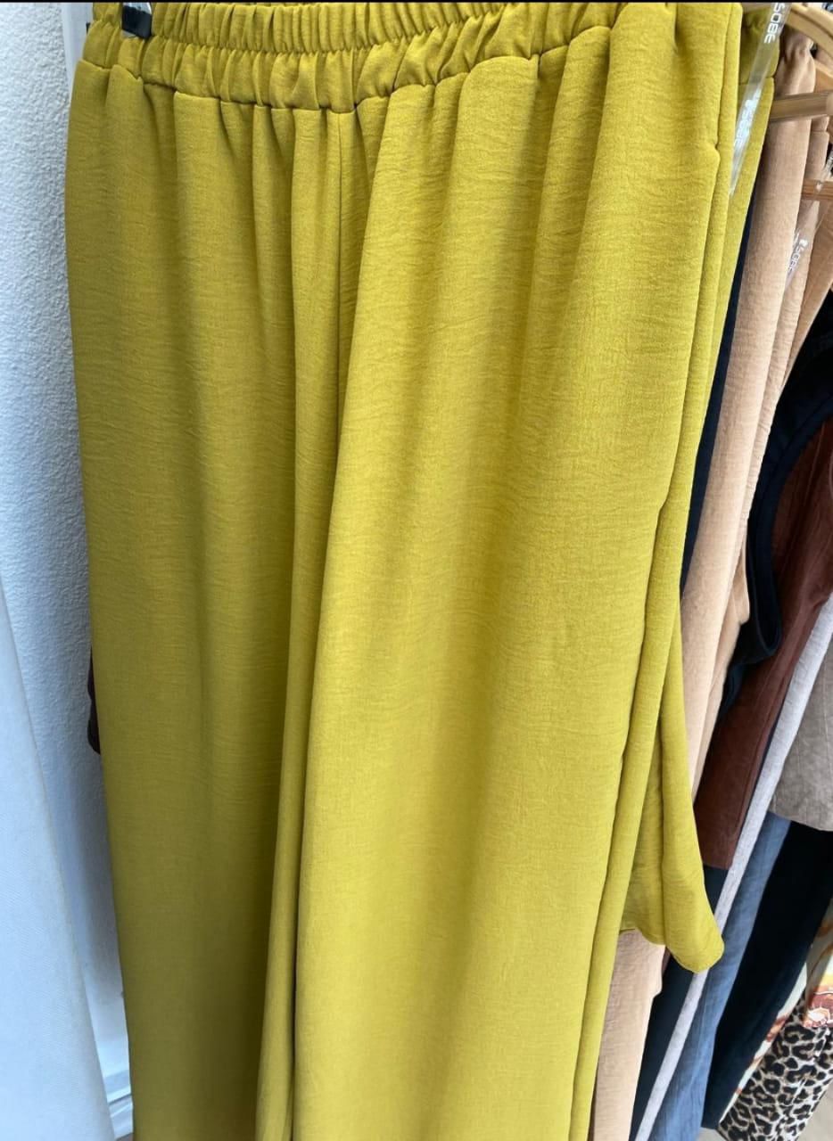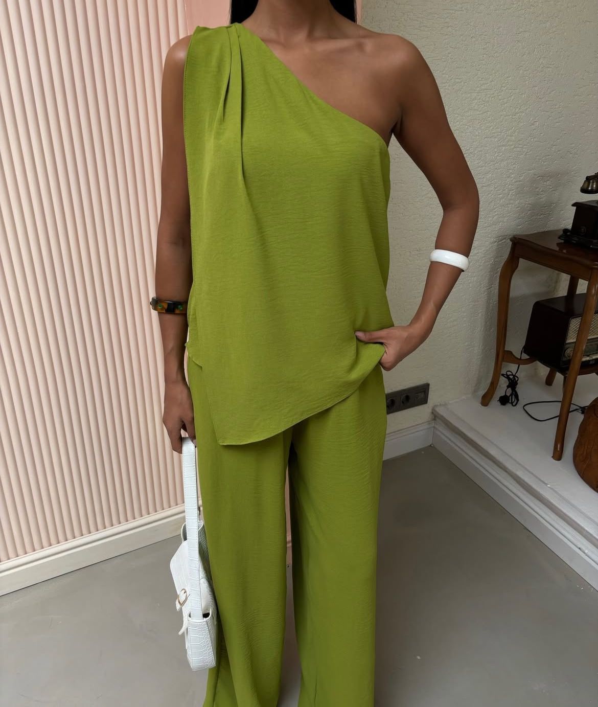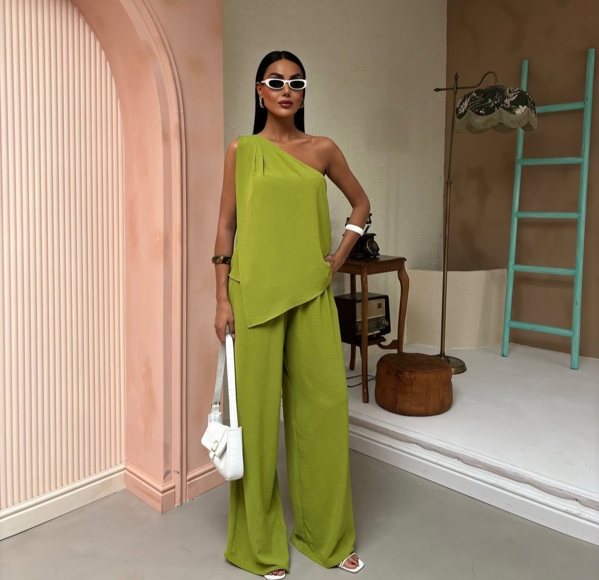 An effortlessly cool two-piece featuring an asymmetrical top and flowy pants.